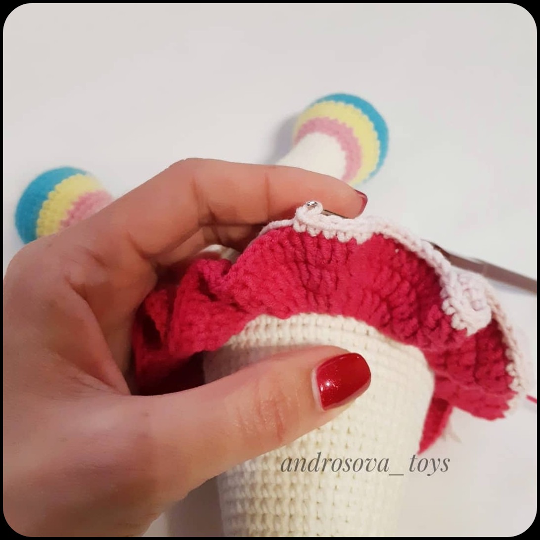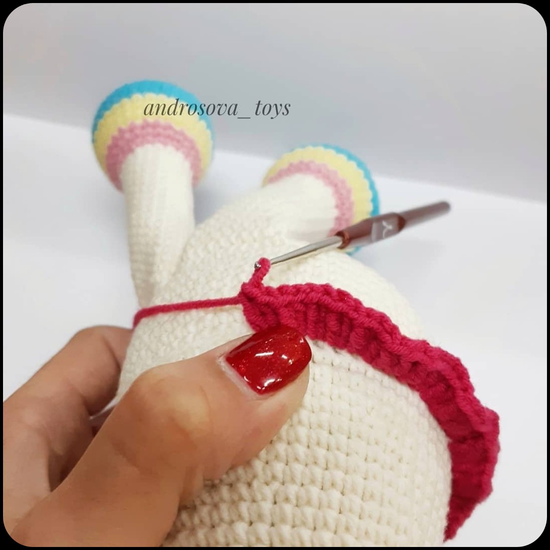 5-6) 2 ch, 180 dc, ss (180) if you want a longer skirt, you can also tie 3 rows. Continue with white color