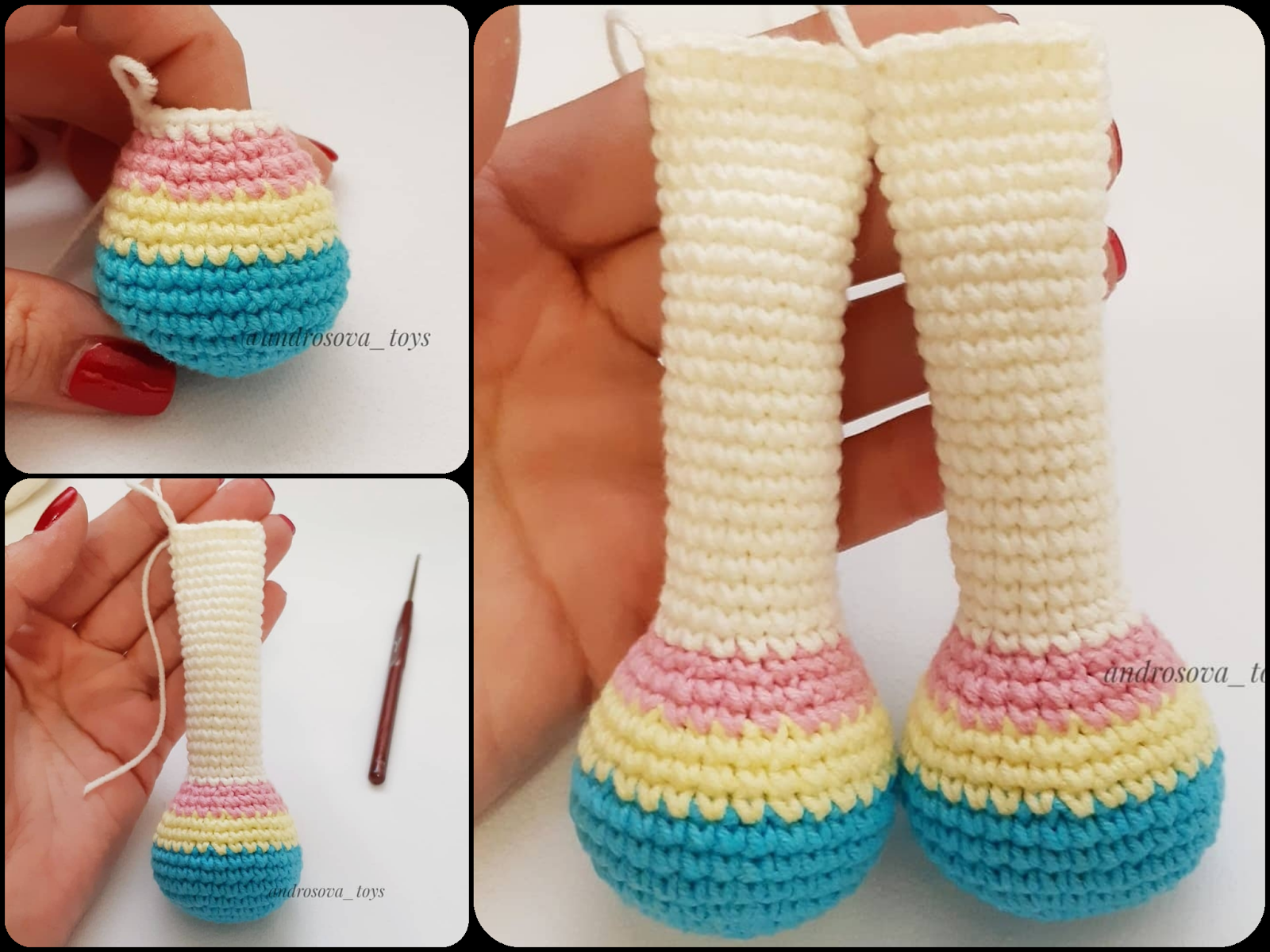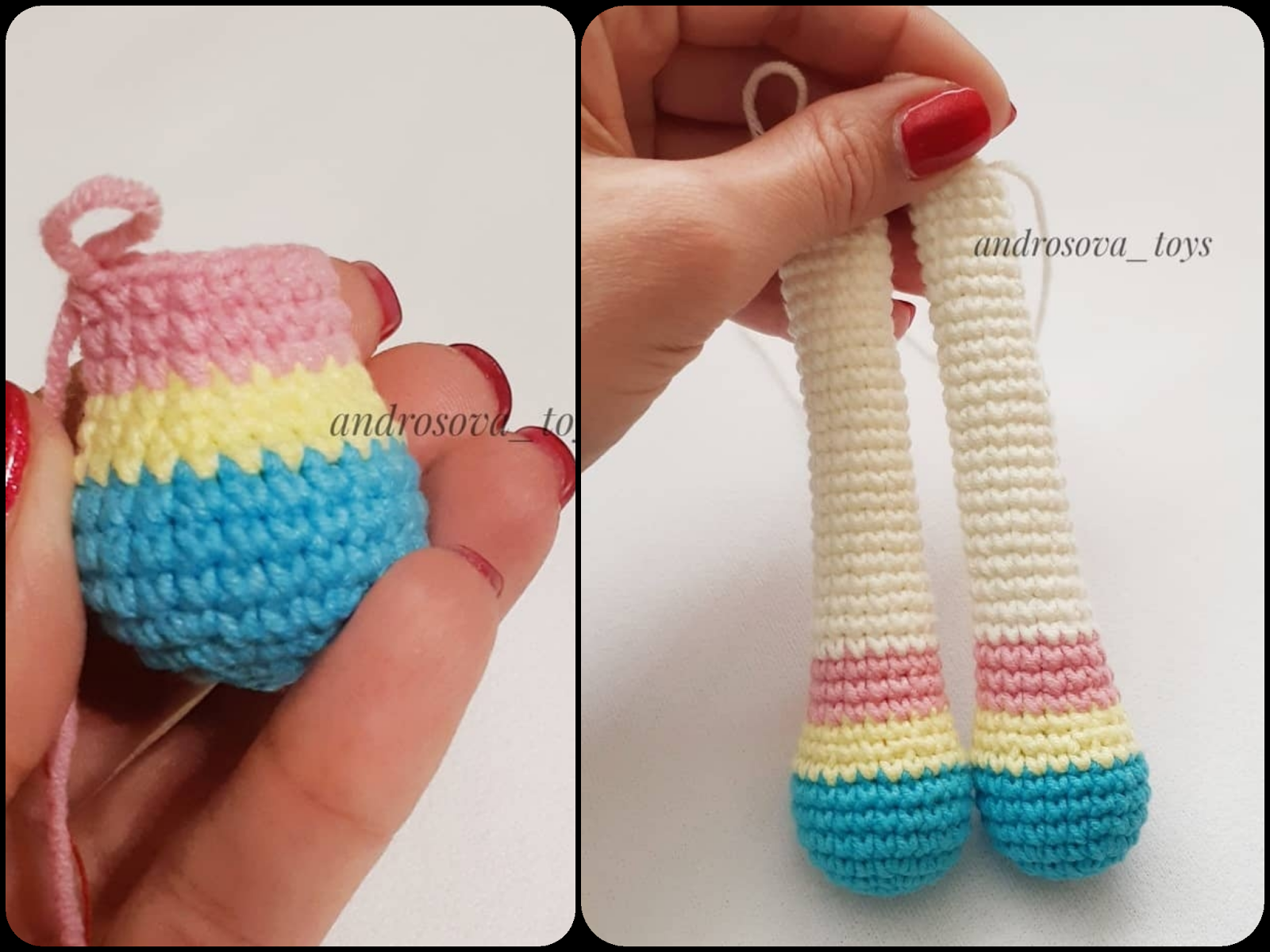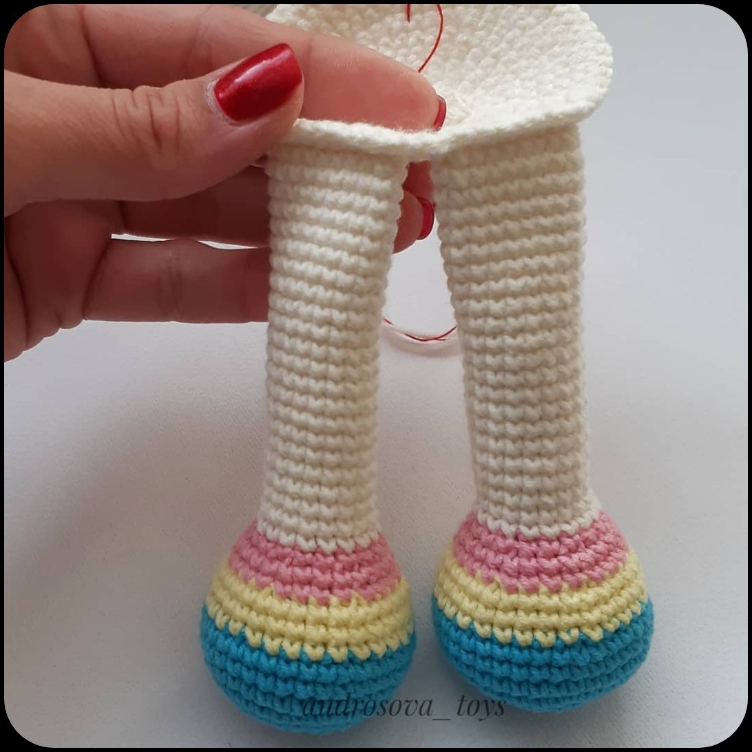 11) (9 sc, inc)*2, 9 sc along wıth leg, inc, 9c along with leg, inc, (9 sc, inc)*2 (66)